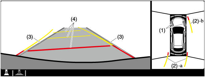 Indicates the approximate projected path of the vehicle. Moves in conjunction with the steering wheel operation. a) Indicates the path where the edge of the rear bumper is expected to travel. b) Indicates the path where the outer side of the vehicle is expected to travel. |