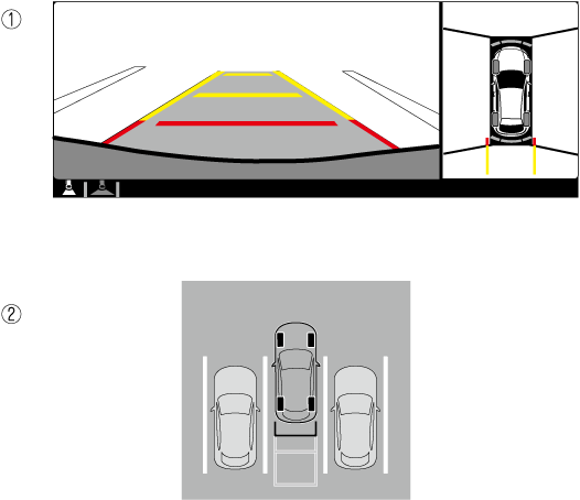 Because there might be a difference between the image displayed on the screen, such as indicated in the following, and the actual conditions when parking, always check the safety at the rear of the vehicle and the surrounding area directly with your eyes.