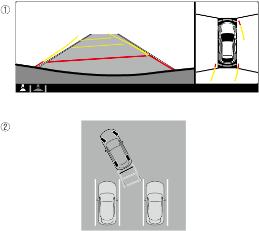 The following shows an example of vehicle parking with the steering wheel turned to the left while backing up the vehicle. When backing into a parking space from the opposite direction, the steering operation is reversed.