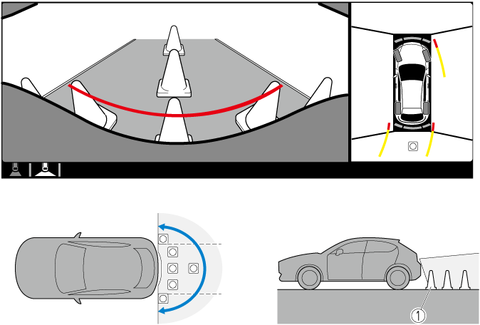 Use the top view/rear wide view to assist in checking the safety of the surrounding area when accelerating from a stop, parking, or stopping the vehicle.