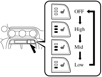 Press the seat warmer switch while the ignition is switched ON to operate the seat warmer. The indicator lights turn on to indicate that the seat warmer is operating. The mode changes as follows each time the seat warmer switch is pressed.
