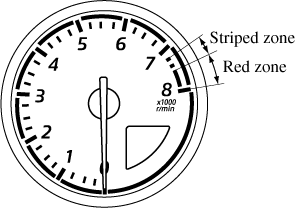 When the tachometer needle enters the STRIPED ZONE, this indicates to the driver that the gears should be shifted before entering the RED ZONE.