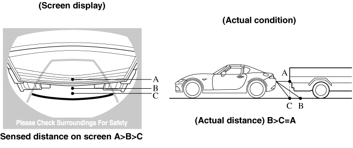 When there is a steep upgrade (downgrade) behind the vehicle, the object displayed on the screen appears farther (downgrade: closer) than the actual distance.