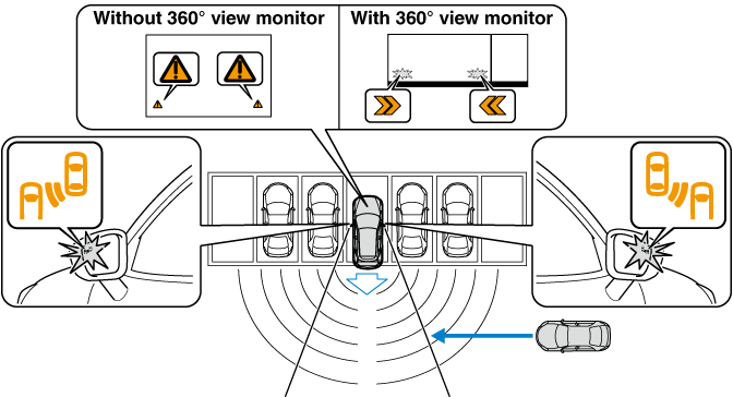 The RCTA warning indication in the 360° view monitor also synchronizes with the Blind Spot Monitoring (BSM) warning indicator light on the door mirrors.