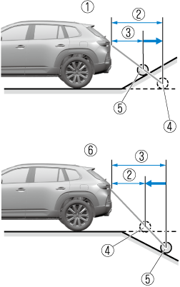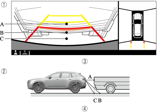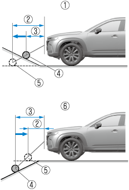 If the vehicle is on a slope, obstructions taken by the camera can appear farther or closer than the actual distance from the vehicle.