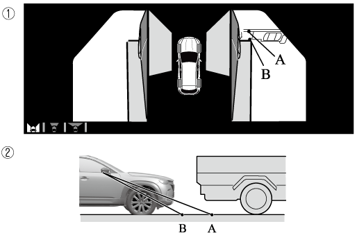 Because the vehicle front end guide lines (side camera) or the distance guide lines (rear camera) are displayed based on a flat surface, the distance to the three-dimensional object displayed on the screen is different from the actual distance.