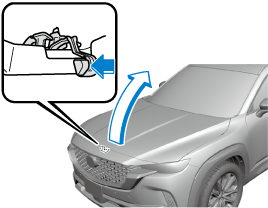 Insert your hand into the hood opening, slide the latch lever in the direction of the arrow as shown in the illustration, and lift up the hood.