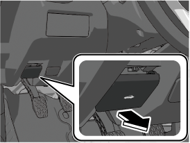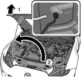 Insert your hand into the hood opening, slide the latch lever in the direction of the arrow as shown in the illustration, and lift up the hood.