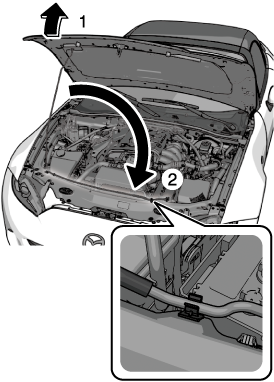 Lift the hood, grasp the padded area on the support rod, and secure the support rod in the clip. Verify that the support rod is secured in the clip before closing the hood.