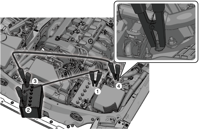 Using commercially available booster cables, connect the lead-acid battery of the booster vehicle’s battery to the lead-acid battery of your vehicle and start the engine.