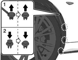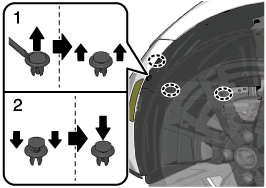Pull the center of each plastic retainer and remove the retainers, and then partially peel back the mudguard.