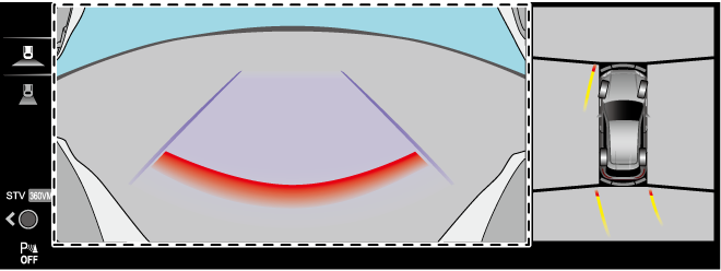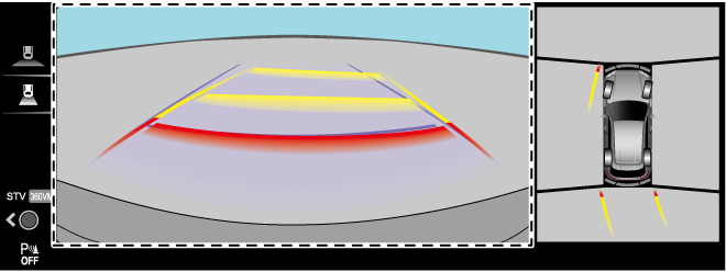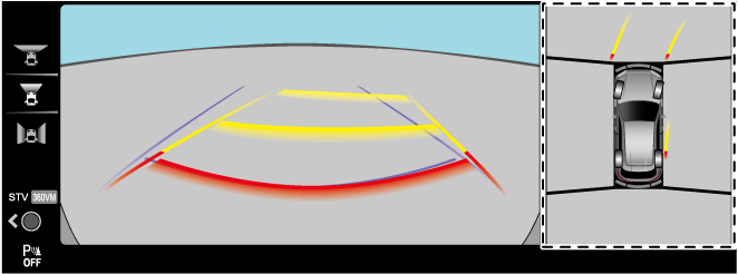 Displays an image of the rear of the vehicle (wide area) together with the guide lines to assist in checking the area at the rear of the vehicle when reversing, parking, or stopping.
