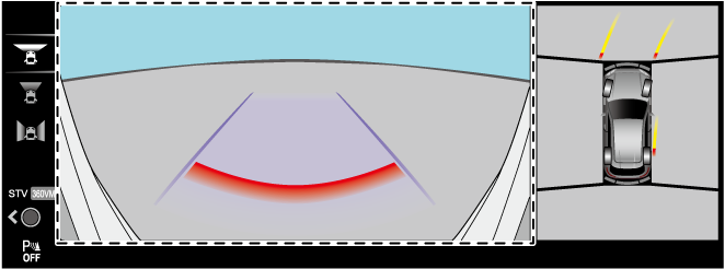 Displays a camera image of the rear of the vehicle as though it was transparent together with the guide lines to assist in checking the area at the rear/sides of the vehicle when reversing, parking, or stopping.