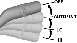 In the LO position, the windshield wipers operate at low speed. In the HI position, the wipers operate at high speed.