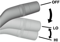 In the LO position, the windshield wipers operate at low speed. In the HI position, the wipers operate at high speed.