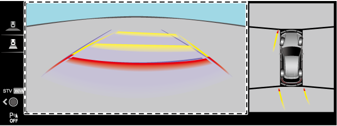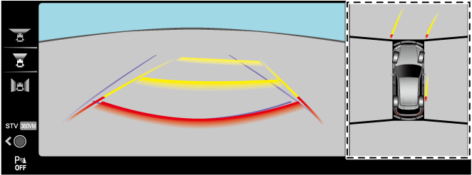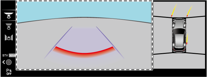 Displays an image of the rear of the vehicle (wide area) together with the guide lines to assist in checking the area at the rear of the vehicle when reversing, parking, or stopping.
