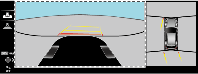 Displays an image of the front left and right sides of the vehicle together with the guide lines to assist in checking the front left and right sides of the vehicle when driving forward, parking, or stopping.