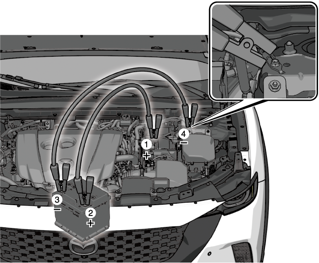 Turn off the booster vehicle's engine and connect the jumper cables in the following order.