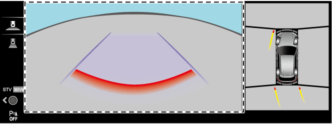 Displays a camera image of the rear of the vehicle as though it was transparent together with the guide lines to assist in checking the area at the rear/sides of the vehicle when reversing, parking, or stopping.