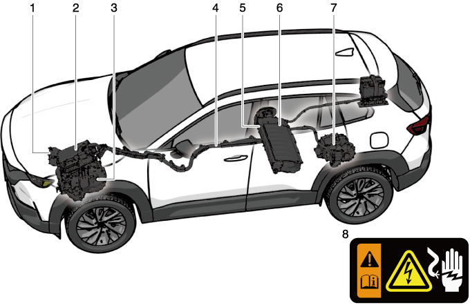 The hybrid system and the engine become hot when they operate. Follow the instructions on the label attached to the vehicle and always pay attention to high voltage areas and high temperature areas.