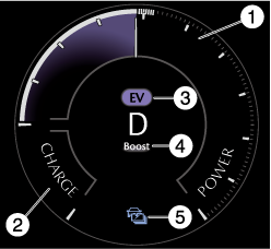 Displays the energy charged in the high voltage battery by regenerative braking. The higher the charge, the more the power meter needle moves downward.