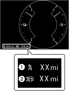 The maximum driving distance is calculated and displayed based on the current remaining charge of the high voltage battery/fuel tank level and the electrical power consumption rate/fuel economy. When the maximum driving distance is 50 km (30 miles) or farther, the maximum driving distance indication decreases in 10 km (10 mile) increments, and when the maximum driving distance is shorter than 50 km (30 miles), it decreases in 1 km (1 mile) increments.