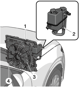 Working near the cooling fan when it is running is dangerous. The fan could continue running indefinitely even if the hybrid system has stopped and the engine compartment temperature is high. You could be hit by the fan and seriously injured.
