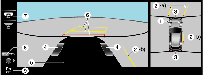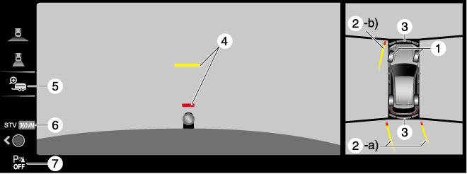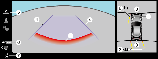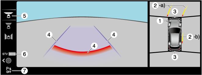 Indicates the approximate projected path of the vehicle. Moves in conjunction with the steering wheel operation. a) Indicates the path where the rear end of the rear bumper passes as a reference. b) Indicates the path where the outer side of the vehicle is expected to travel. |