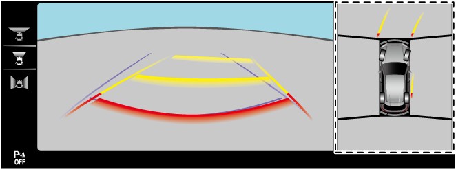 Displays an image of the rear of the vehicle together with the guide lines to assist in checking the area at the rear of the vehicle when reversing, parking, or stopping.