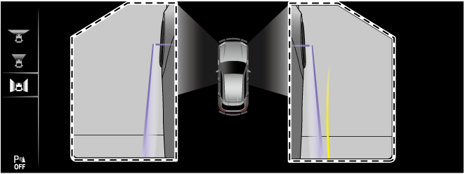 Displays an image of the front left and right sides of the vehicle together with the guide lines to assist in checking the front left and right sides of the vehicle when driving forward, parking, or stopping.