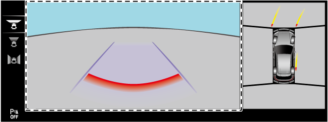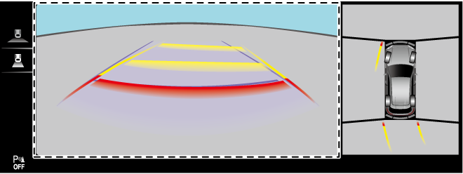 Displays an image of the rear of the vehicle (wide area) together with the guide lines to assist in checking the area at the rear of the vehicle when reversing, parking, or stopping.