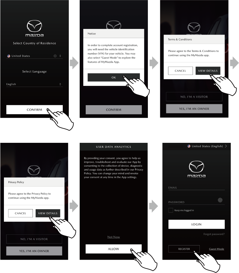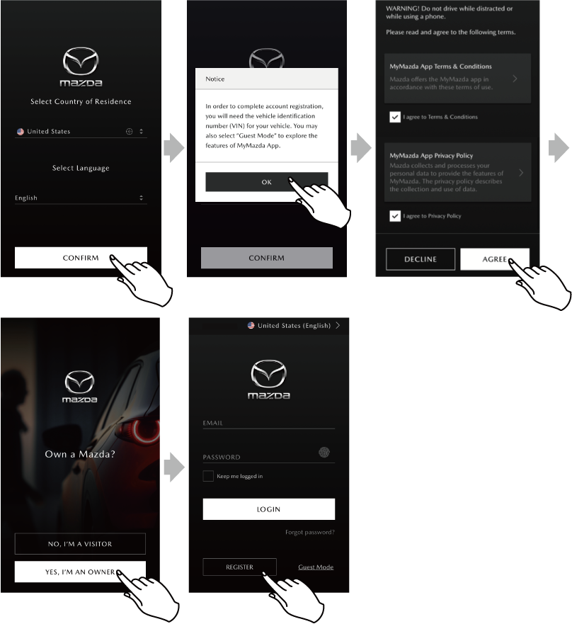 • When first launching the MyMazda APP, select of your country and language, and agreement to the Terms & Conditions and the Privacy Policy is required.