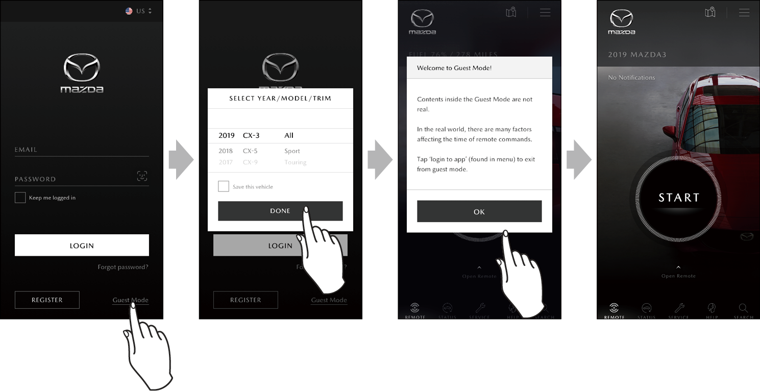 The MyMazda APP comes with a guest mode for a simulated experience of Connected Service. You can do a demo run on the contents of Connected Service even if you do not have a user account and registered vehicle.