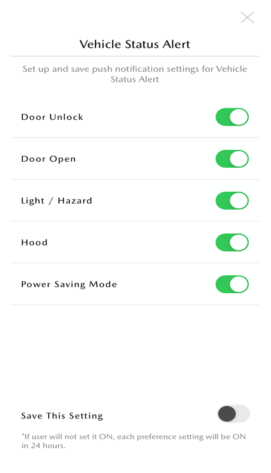 • You can individually set whether you want to receive Vehicle Status Alert notifications. You can continue to be notified of the set items by saving your settings. If you do not save the settings, all settings will be turned on in 24 hours after setting them.