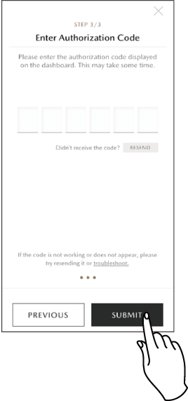 Enter the Authorization Code displayed on the center display into your device and touch SUBMIT.