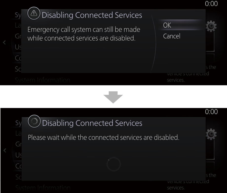 After a few moments, a screen is displayed indicating [Connected Services] (or [Online Connectivity]) as unchecked and then the setting is completed.