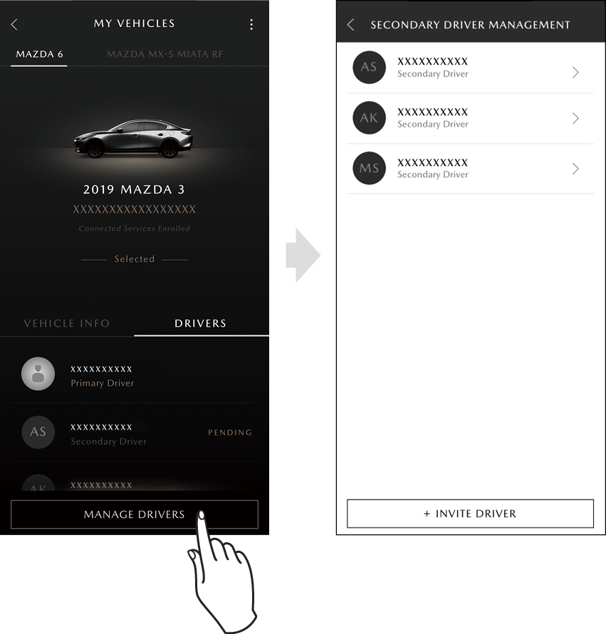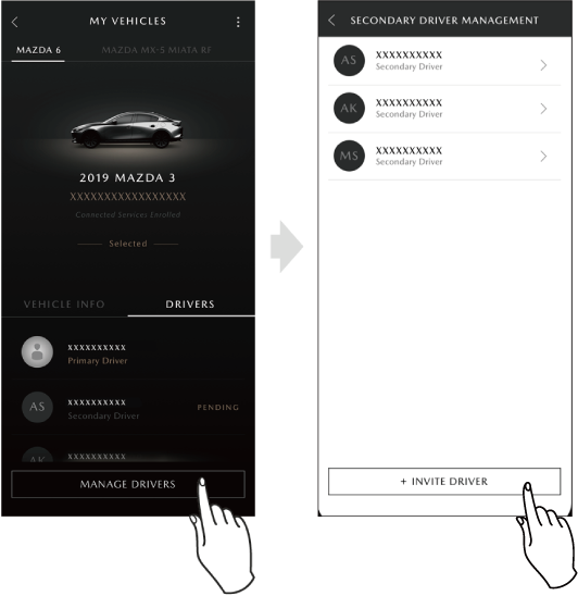 Touch MANAGE DRIVERS on the MY VEHICLES screen, and then touch +INVITE DRIVER.