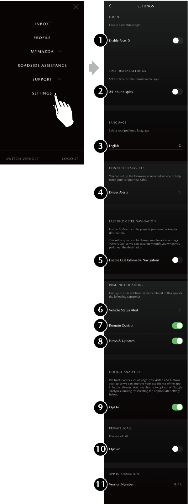 11 Version Number Displays the MyMazda APP version number.
