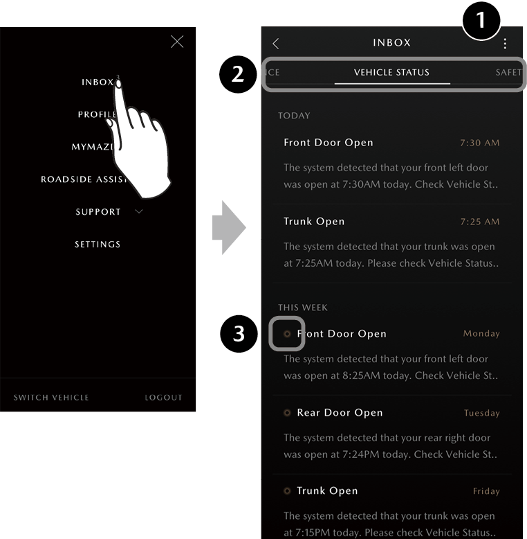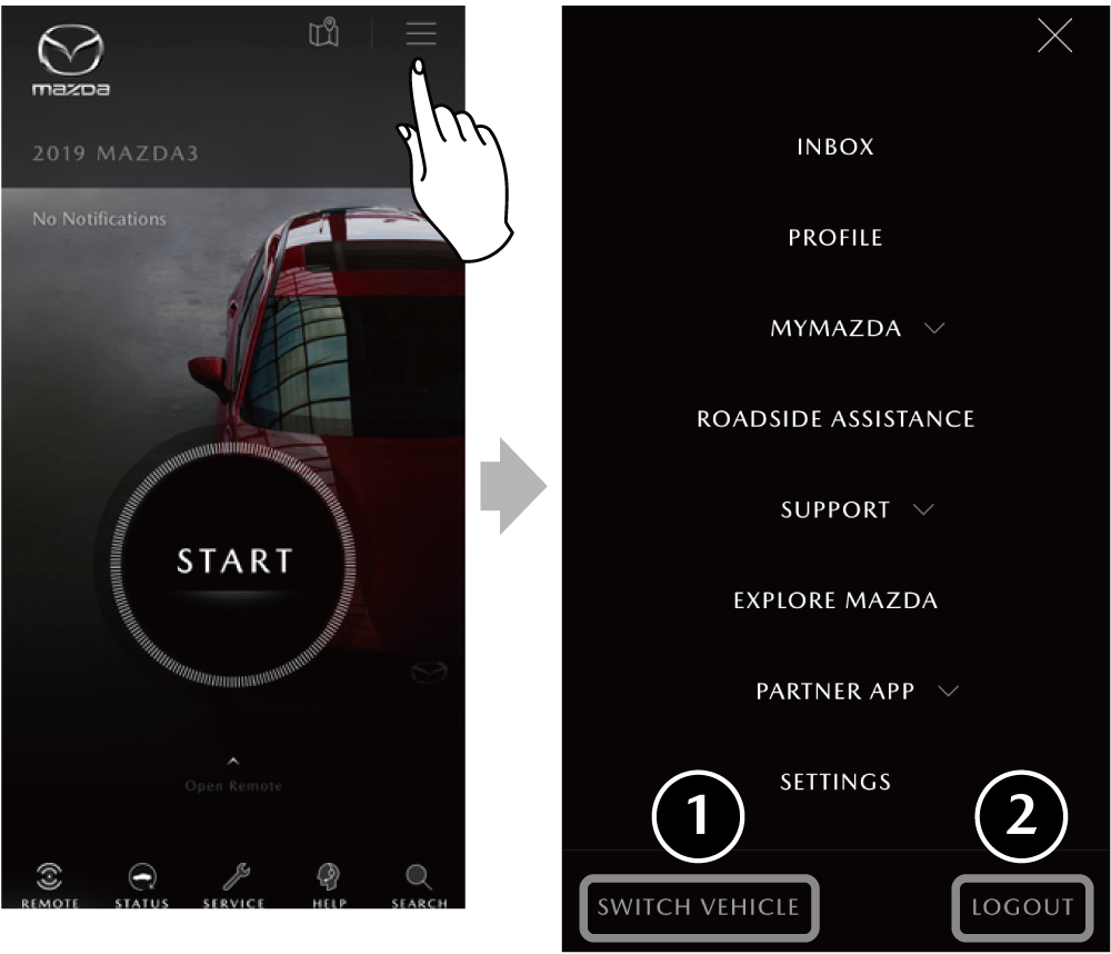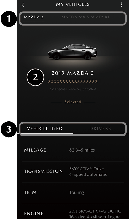 1 Vehicle Tab If you have registered two or more vehicles, the target vehicles for the MyMazda APP can be switched.