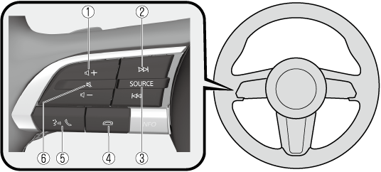 SOURCE button: The audio source can be switched each time the button is pressed. In addition, when the button is pressed and held, the current audio source is muted and the audio source selection screen is displayed.