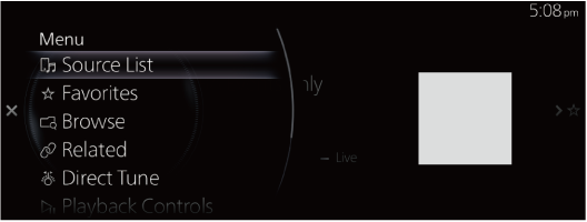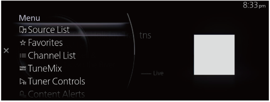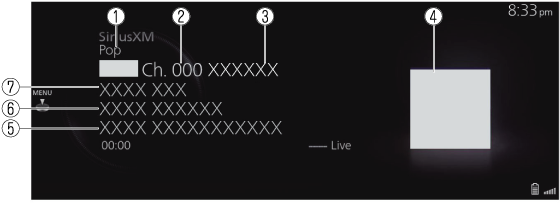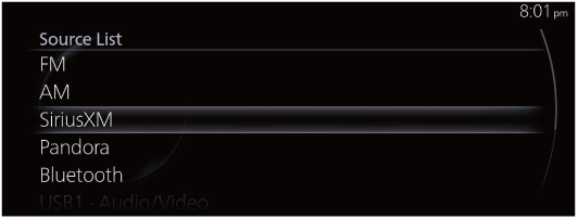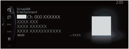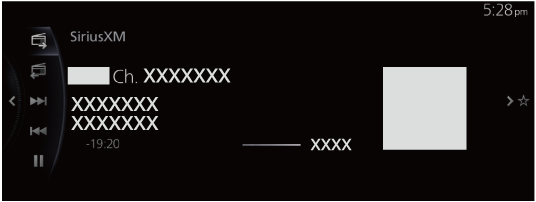 Displays the Favorites list for SiriusXM®. The radio station list registered to your Favorites is displayed where you can select the radio station you want to listen to. If you have no registered Favorites, an empty list is displayed. Refer to Favorites (Search) for the method of registering to Favorites. |