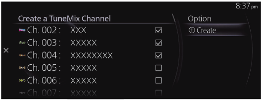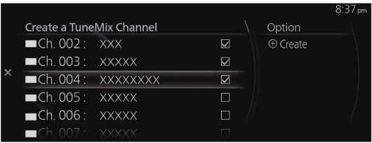 Select several radio stations you want to register to the TuneMix™ Channel from the SiriusXM® music channel list. A check is placed next to the selected station.