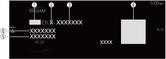 Displays the Favorites list for SiriusXM®. The radio station list registered to your Favorites is displayed where you can select the radio station you want to listen to. If you have no registered Favorites, an empty list is displayed. Refer to Favorites (Search) for the method of registering to Favorites. Smart Favorites Broadcasts of registered stations are buffered. Also, when registering radio stations to Favorites, up to 10 stations are registered to Smart Favorites automatically. |